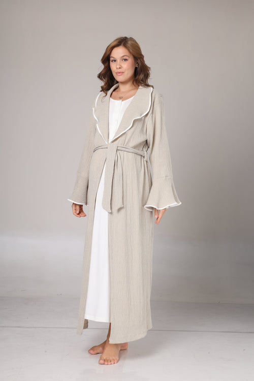 Ekru Biyeli Sabahlıklı Kruvaze Lohusa Gecelik Takımı